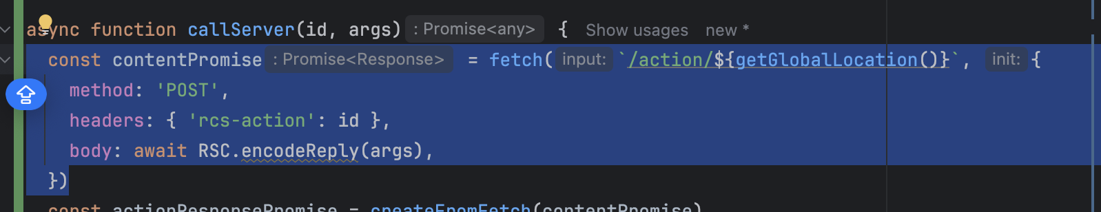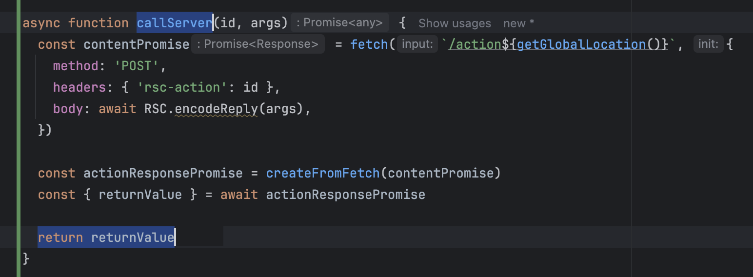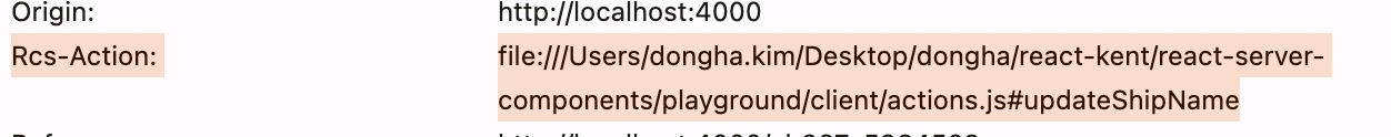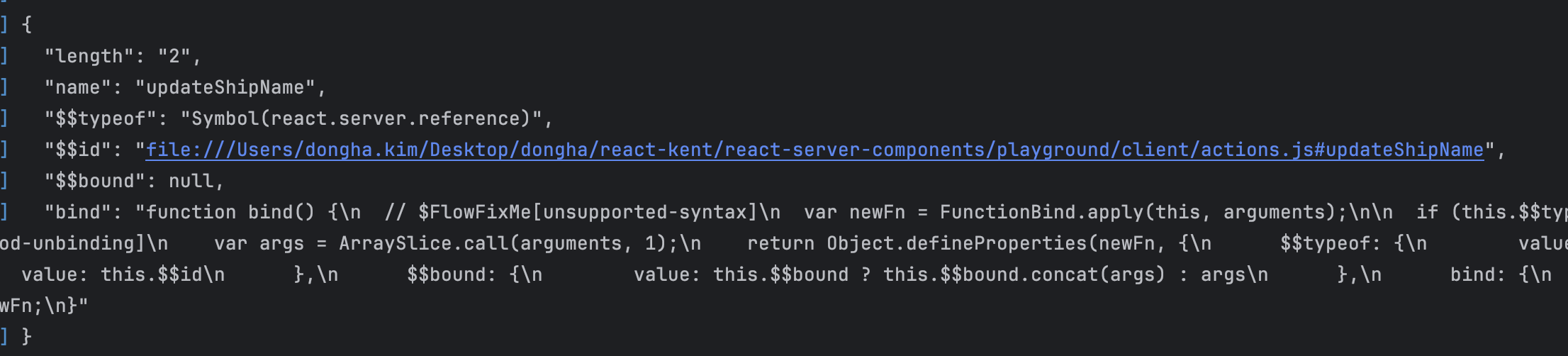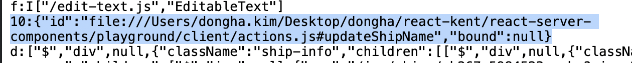 (현재는 서버 함수 경로가 전체 경로로 나오는데 프로덕션 환경에서는 번들러가 경로를 해시 또는 ID로 변환다.
