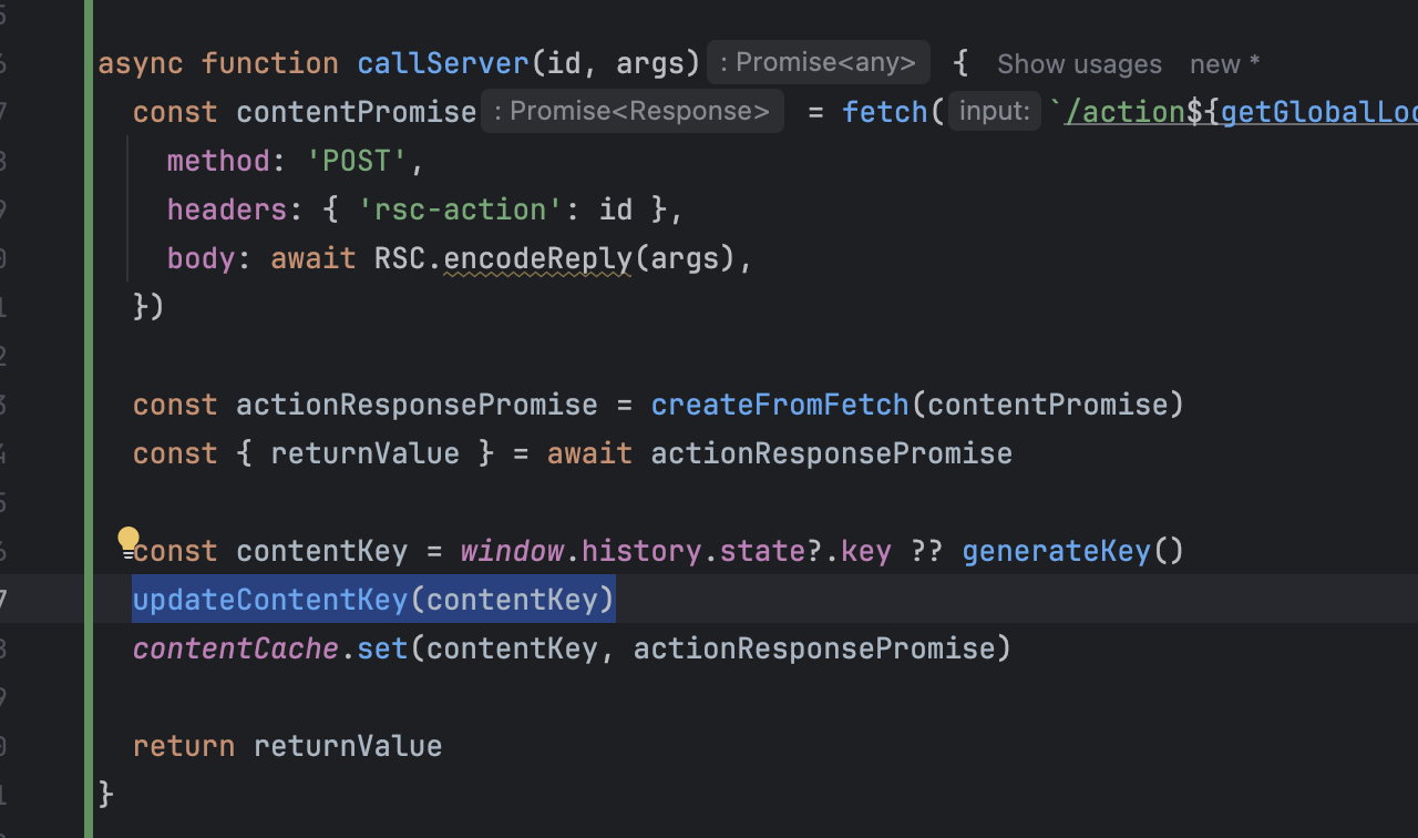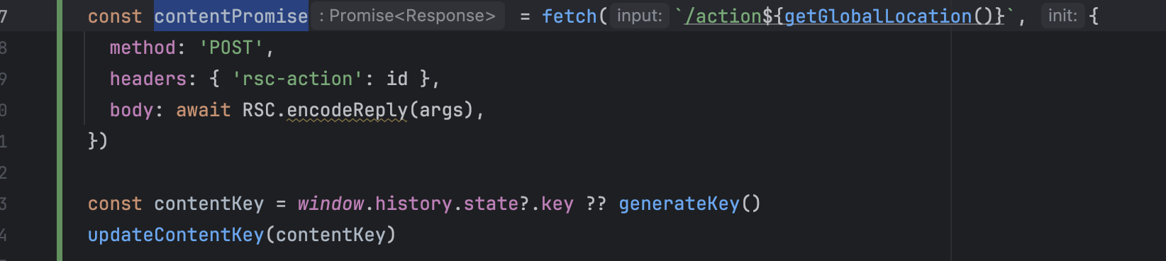 서버 액션 요청 보내고 응답으로 RSC Payload를 스트림 형태로 받는다. 그리고 updateContentKey