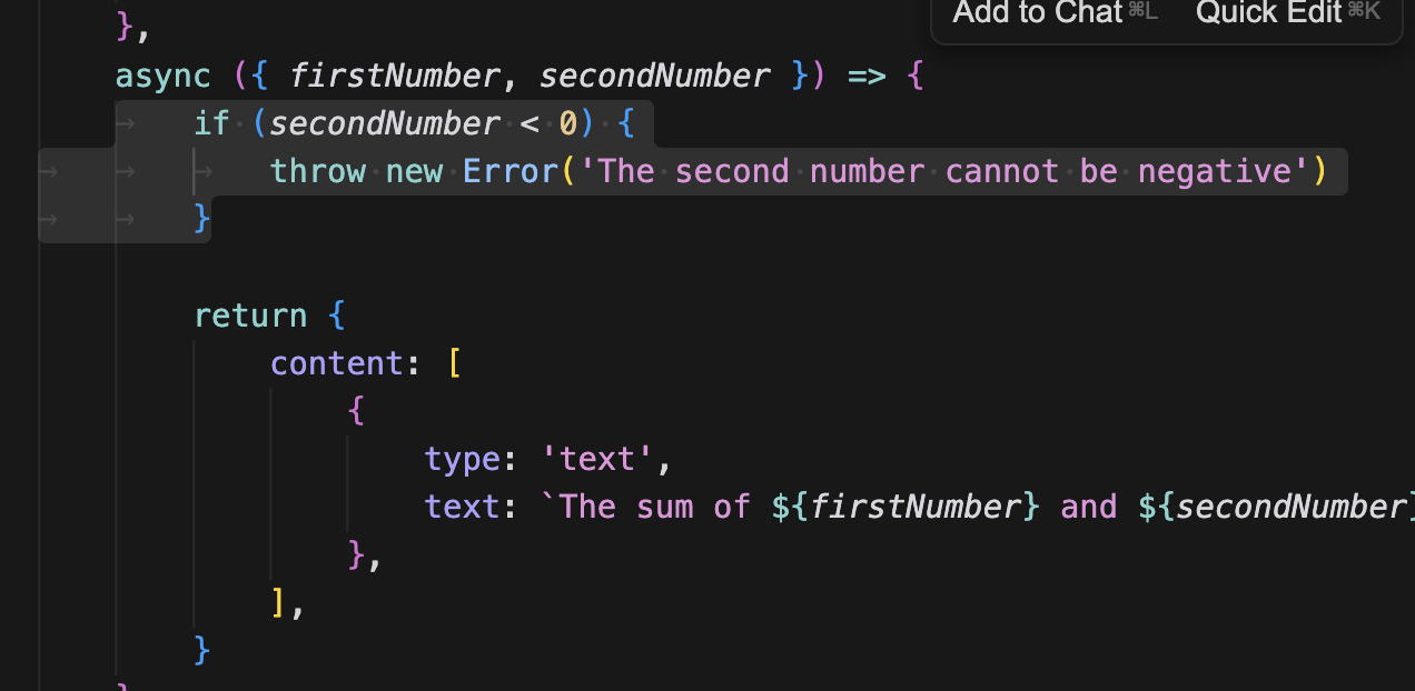 아주 간단하다. 콜백 부분에 예외 처리를 해주면 된다. 이렇게 되면 실제 응답에서 isError: true을 포함하게 되고 MCP TypeScript SDK가 에러 응답 형태로 변환해준다.