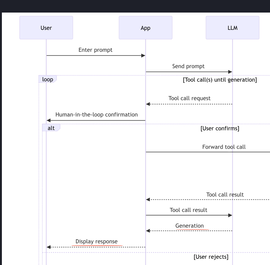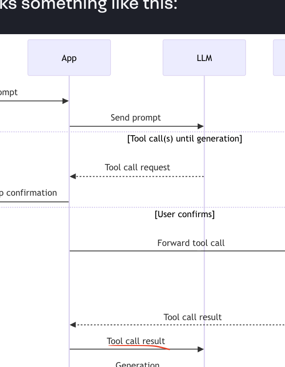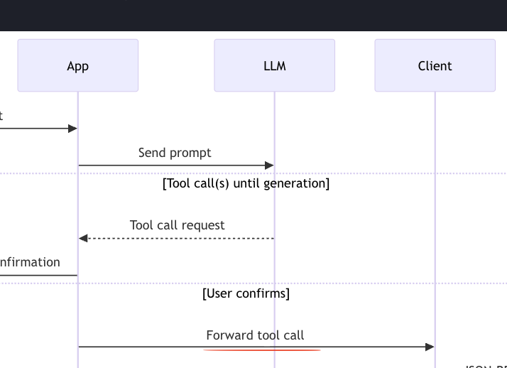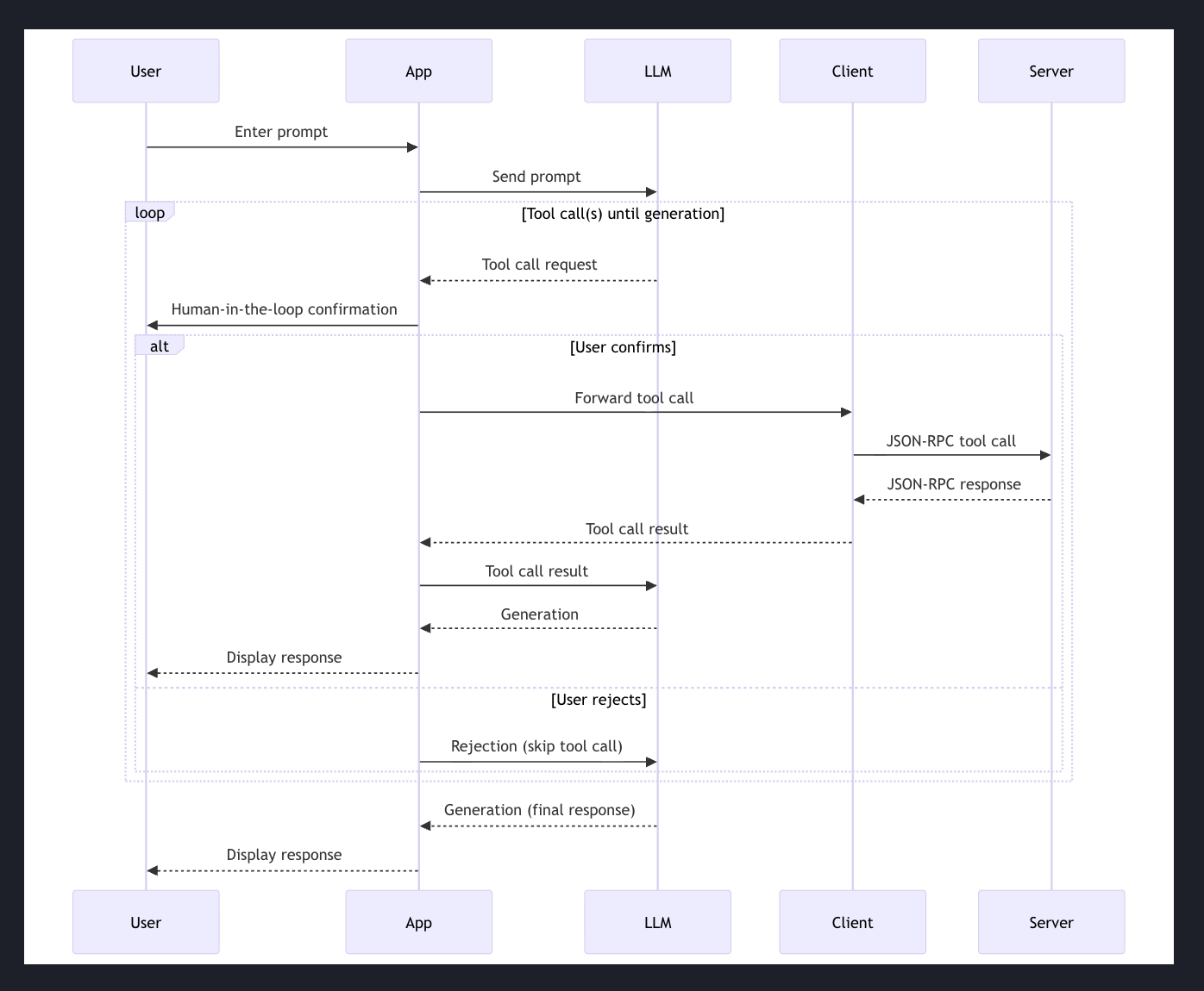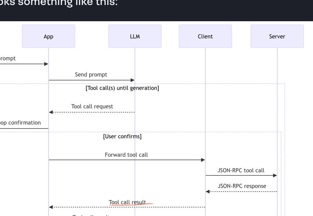 사용자가 확인하면 앱은 그 도구 호출을 클라이언트로 전달하는데, 앱은 LLM이 생성한 인자와 함께 도구 호출 요청을 클라이언트로 넘긴다.