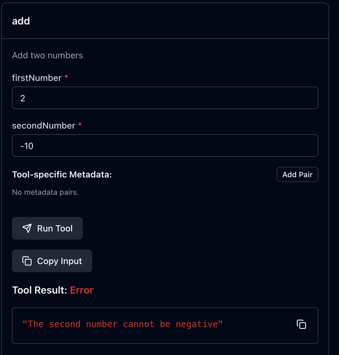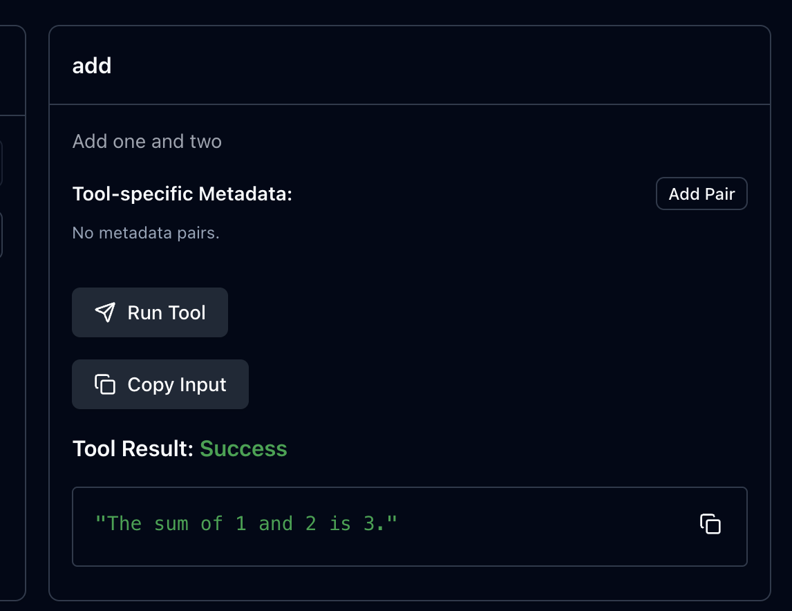 계산기 기능이 있는 툴이 완성된다. 여기서 중요한 점은 zod에 describe()은 LLM에게 이 도구를 언제 써야 하는지 가르치는 지침이라는 점이다.입력 프로퍼티마다 description을 달아주면 LLM이 훨씬 정확히 사용할 수 있다.