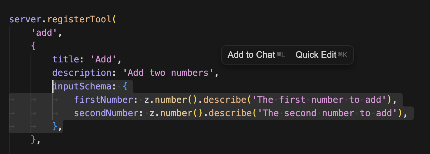 아까 만들었던 registerTool에 zod로 스키마로 주입한다. zod를 사용하는 이유는 타입 검증과 안정성인데, LLM용 스키마의 역할도 한다.