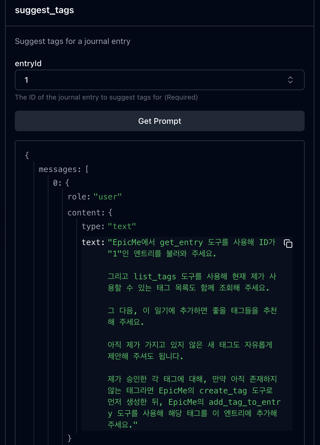그럼, 사용자가 entry를 하나 작성하면 거기에 맞는 태그를 추천해주는 프롬프트를 만든다고 가정하자.