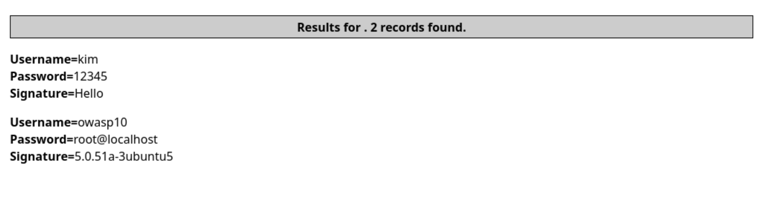 이러한 상황에서 URL에서 username=... 같은 값을 꺼내서 쿼리 문자열을 그대로 이어붙여서 만들고 DB에 실행할 수 있는 문제가 생긴다. 예제를 실습해보자.