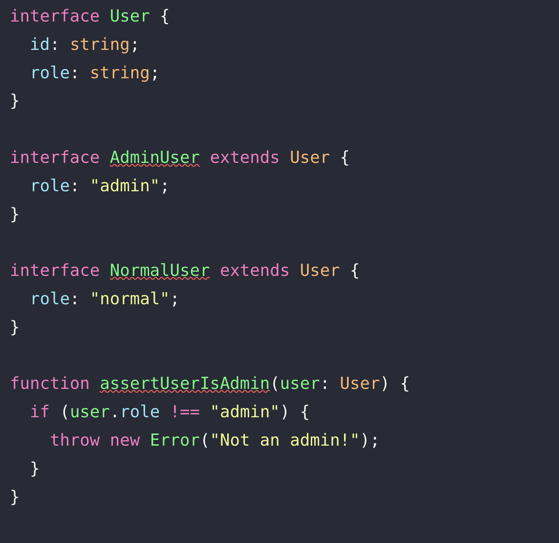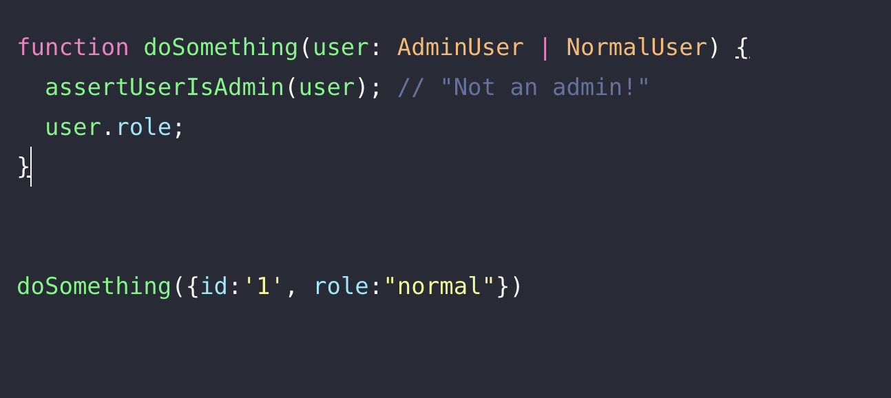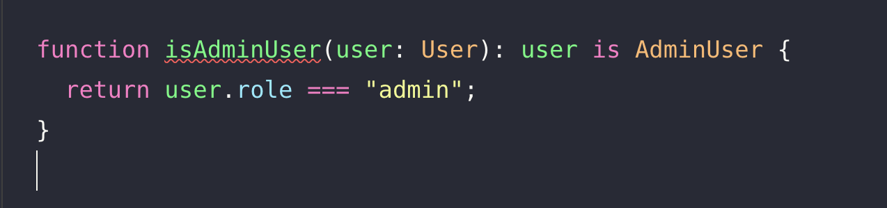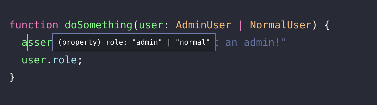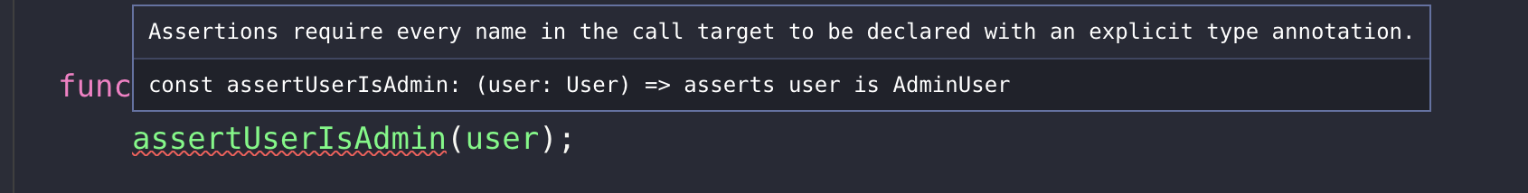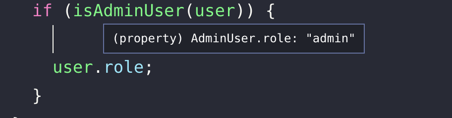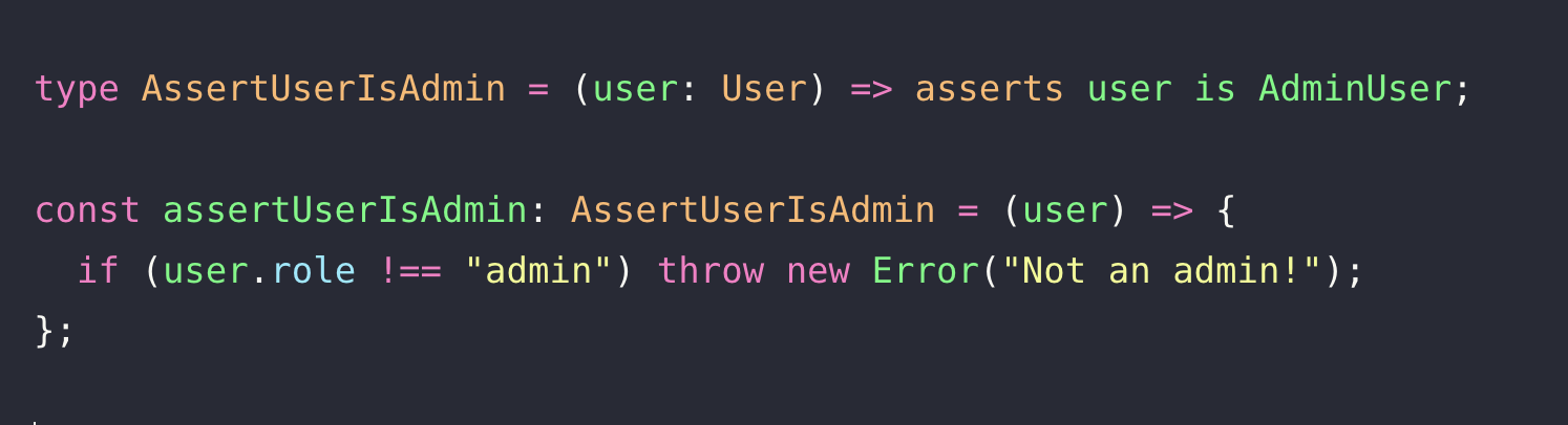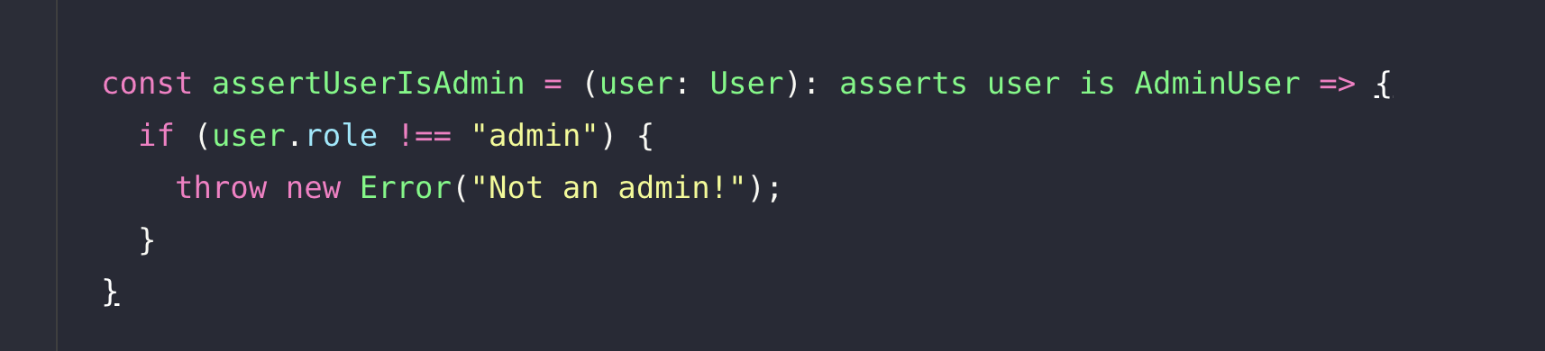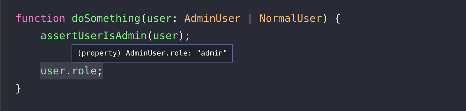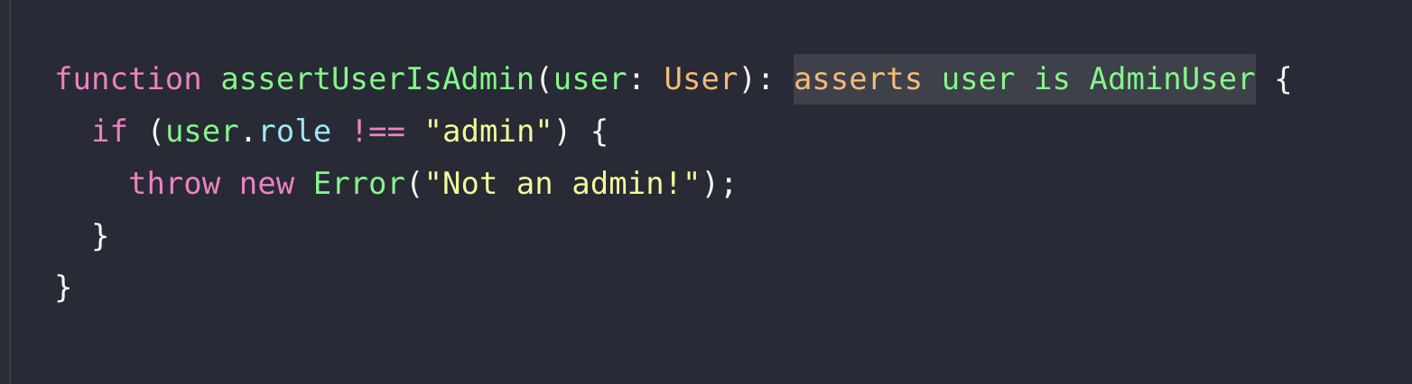 여전히 user를 유니언으로 추론한다. 왜냐면 assertUserIsAdmin은 단순히 런타임 체크이기 때문이다. 타입 레벨에선 달라진 것이 없다.