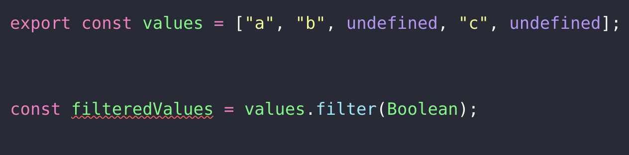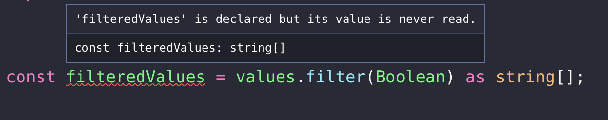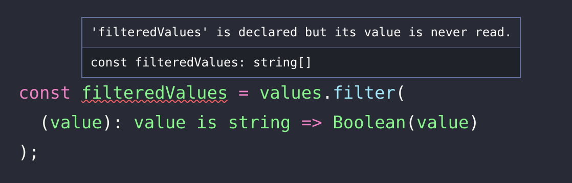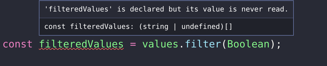 이렇게 undefined를 필터하는 함수가 있다고 가정해보자. filter를 통해 undefined를 제거했지만, filteredValues의 타입은 string[]이 아니라 여전히 (string | undefined)[]이다.