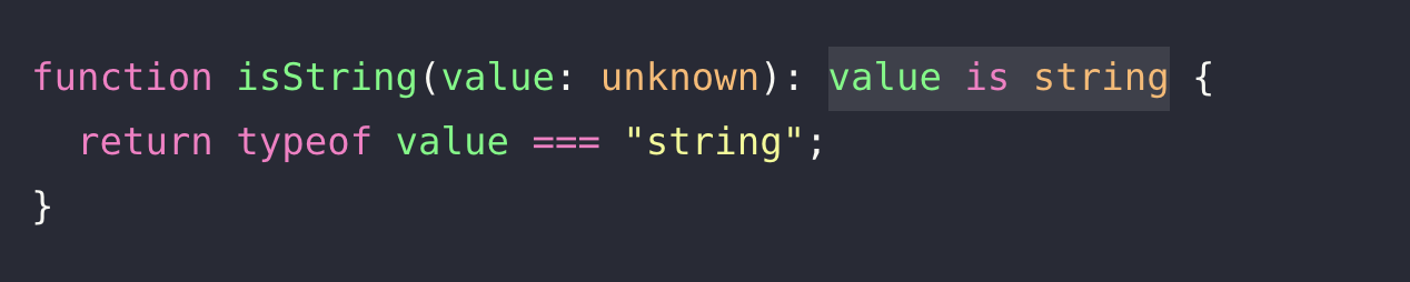 반환 타입을 ~ is string로 작성하는 애들이다. 그냥 as와 비슷한 문법이라고만 생각하고 왜 ~ is string 이런 식으로 쓰는 건지 구체적으로 찾아보진 않았는데, 이참에 알아봐야겠다.