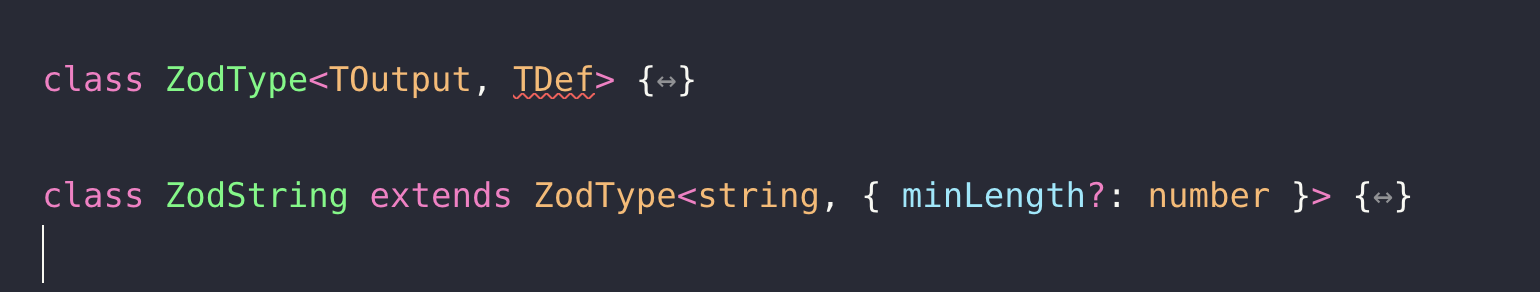 다시 클래스로 돌아가서, Zod는 두 단계의 제네릭으로 이루어져 있는데 ZodString 자체에는 제네릭이 없다. 대신, Base를 상속하여 제네릭 정보를 가져오는 것!