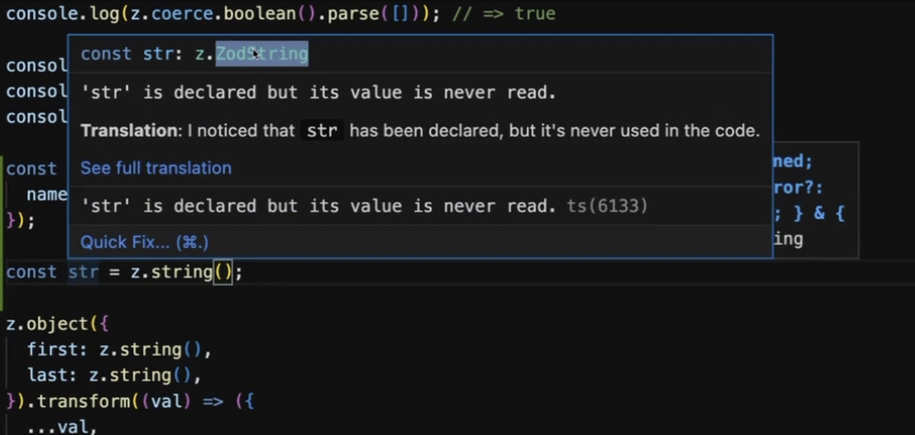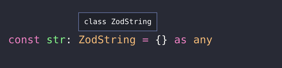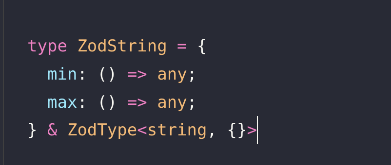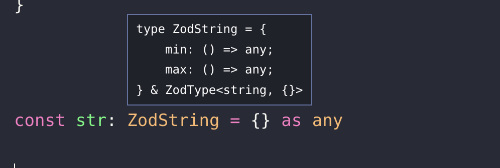 ZodString에 호버를 해보면 내부 타입이 전부 드러나는 것을 확인할 수 있다. TypeScript는 기본적으로 모든 타입을 보여주려 한다. 하지만 때로 복잡한 타입은 감추는 것이 개발에 도움이 될 때도 있다.