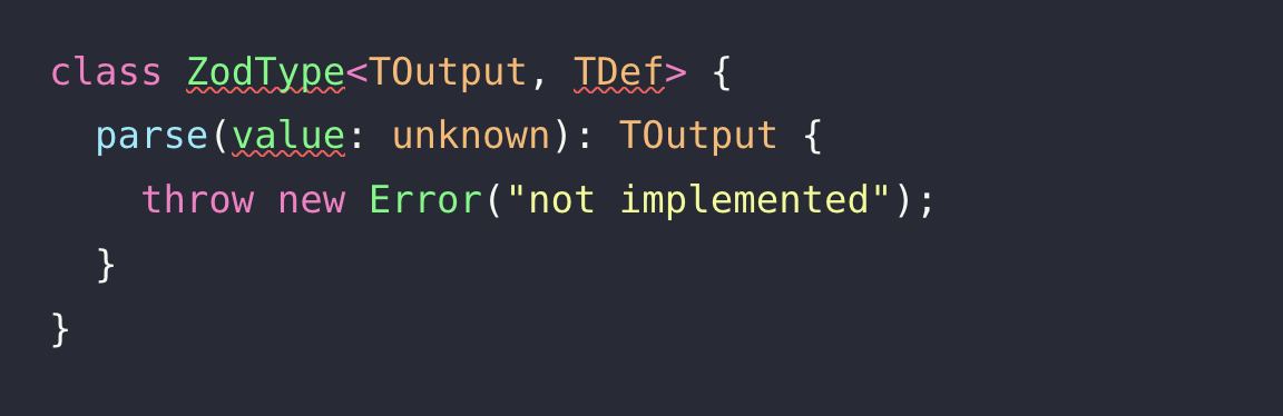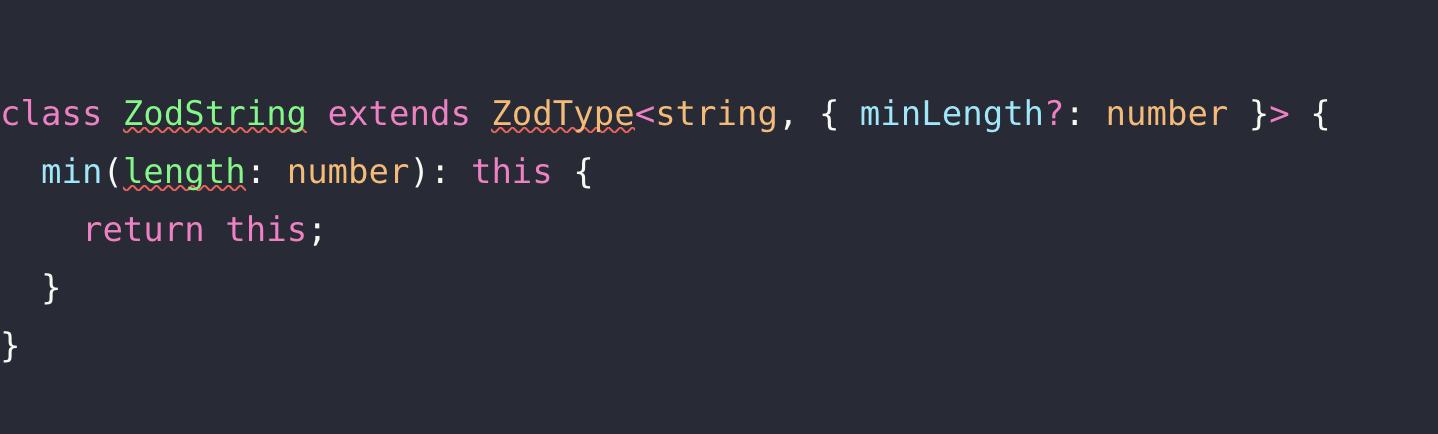 Zod는 클래스로 타입이 작성되었다. ZodType이라는 Base Class가 있고, 다른 클래스들이 Base를 상속받아서 사용하는 식이다. (Zod 내부 타입이 대충 아래처럼 되어 있다고 가정하자)