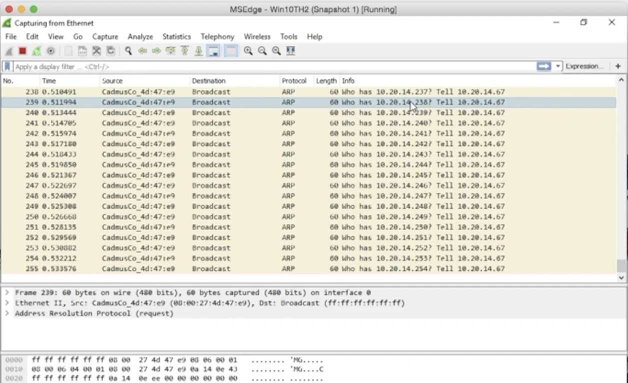 공격자 쪽에서 netdiscover로 네트워크를 스캔하게 되면 와이어샤크는 패킷을 캡처한다.