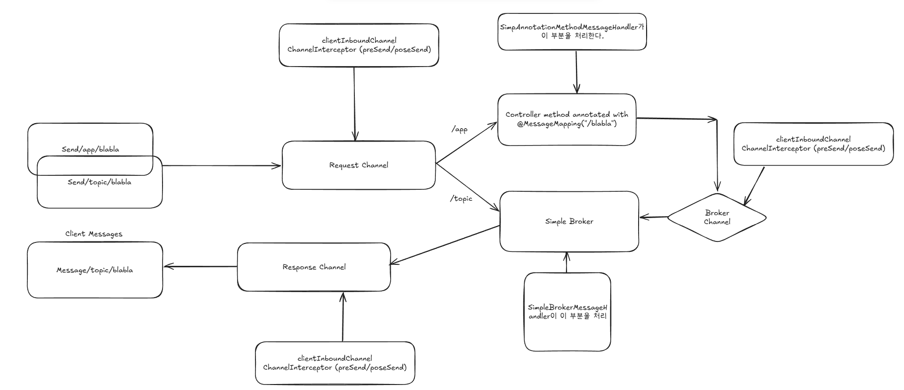 이 인터페이스는 메시지 채널의 전송 과정을 가로채는 인터셉터 인터페이스이다. 이 인터페이스를 사용해서 JWT 토큰 검증을 구현하면 된다.