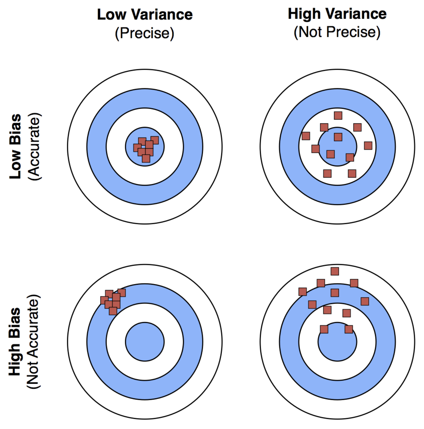 편향에러(bias error)는 알고리즘을 학습하는데에 잘못된 가정을 한 경우이다. 높은 편향은 피쳐와 타깃 아웃풋간의 주요한 상대적 관계에 대해서 놓치게 된다. 따라서 편향이 높은 모델은 과적합이 없는 단순하지만 데이터간 관계성을 놓치는 과소적합(underfitting) 모델을 만드는 결과를 낳는다.