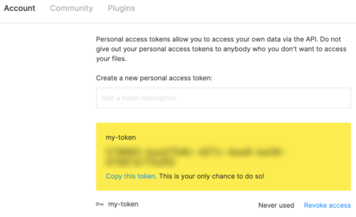 Figma REST API를 사용하기 위해서는 개인 token값이 필요합니다. Token 아래 과정을 통해 생성 가능합니다.