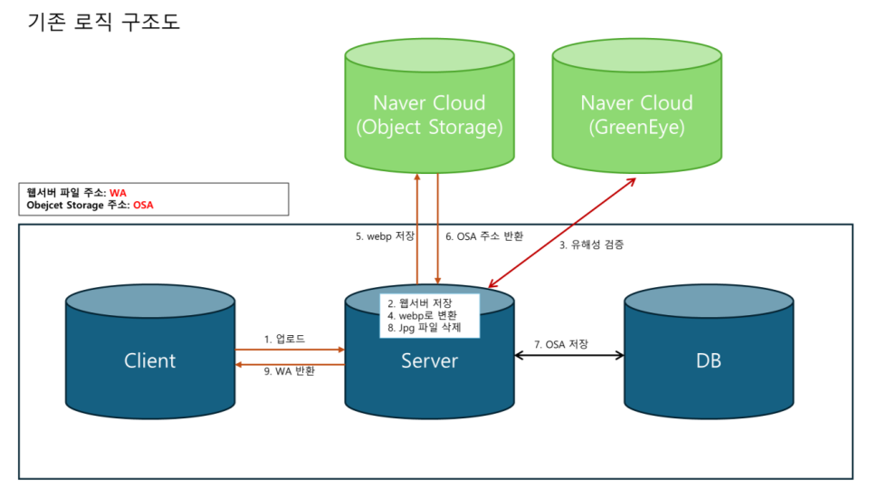 기존에는 사진 파일 처리 로직이 완료된 후, Object Storage 주소를 데이터베이스에 저장하고 이를 클라이언트에 반환하는 방식이었습니다. 이 방식에서는 사진 파일의 유해성 검증과 .webp 변환 작업이 완료된 후, 최종 결과를 반환하기 때문에 전체 처리 시간이 길어지고, 사용자 응답 속도가 느려지는 문제가 발생했습니다.