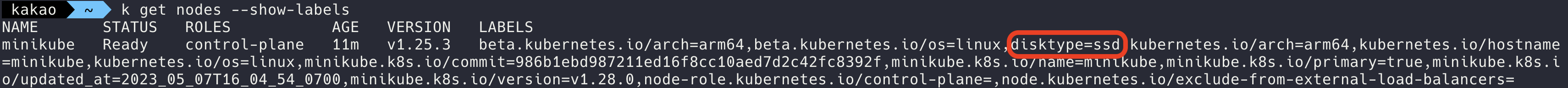 minikube라는 노드에 disktype=ssd라는 라벨이 추가된 것을 확인할 수 있다.