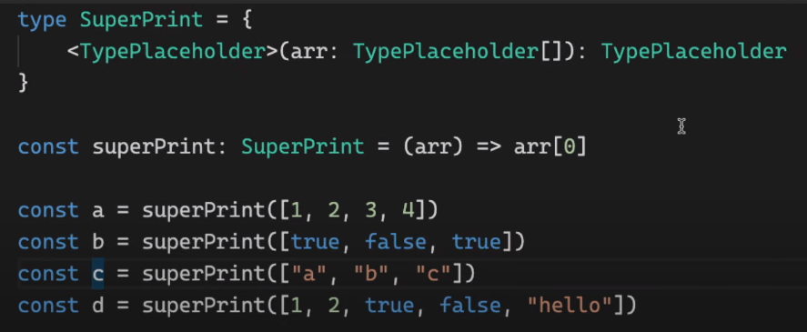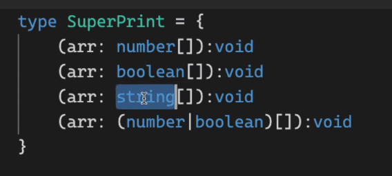 : call signatures 작성 중 들어올 type을 확실히 모를때 사용 이렇게 모든 경우의 수를 지정해 줄 수 없기 때문