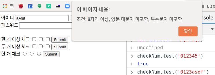 알람메세지와 아이디의 조건, 패스워드의 조건을 모두 처리하는 함수를!