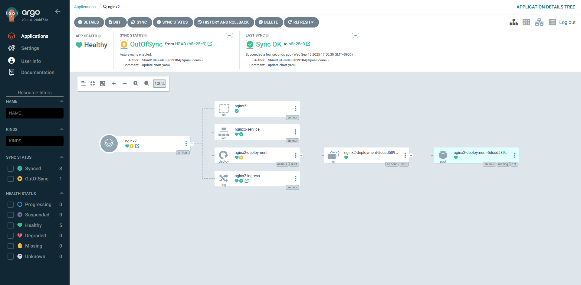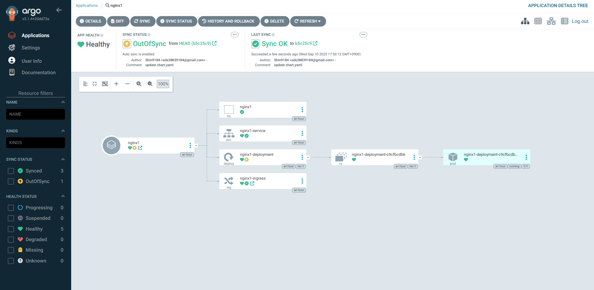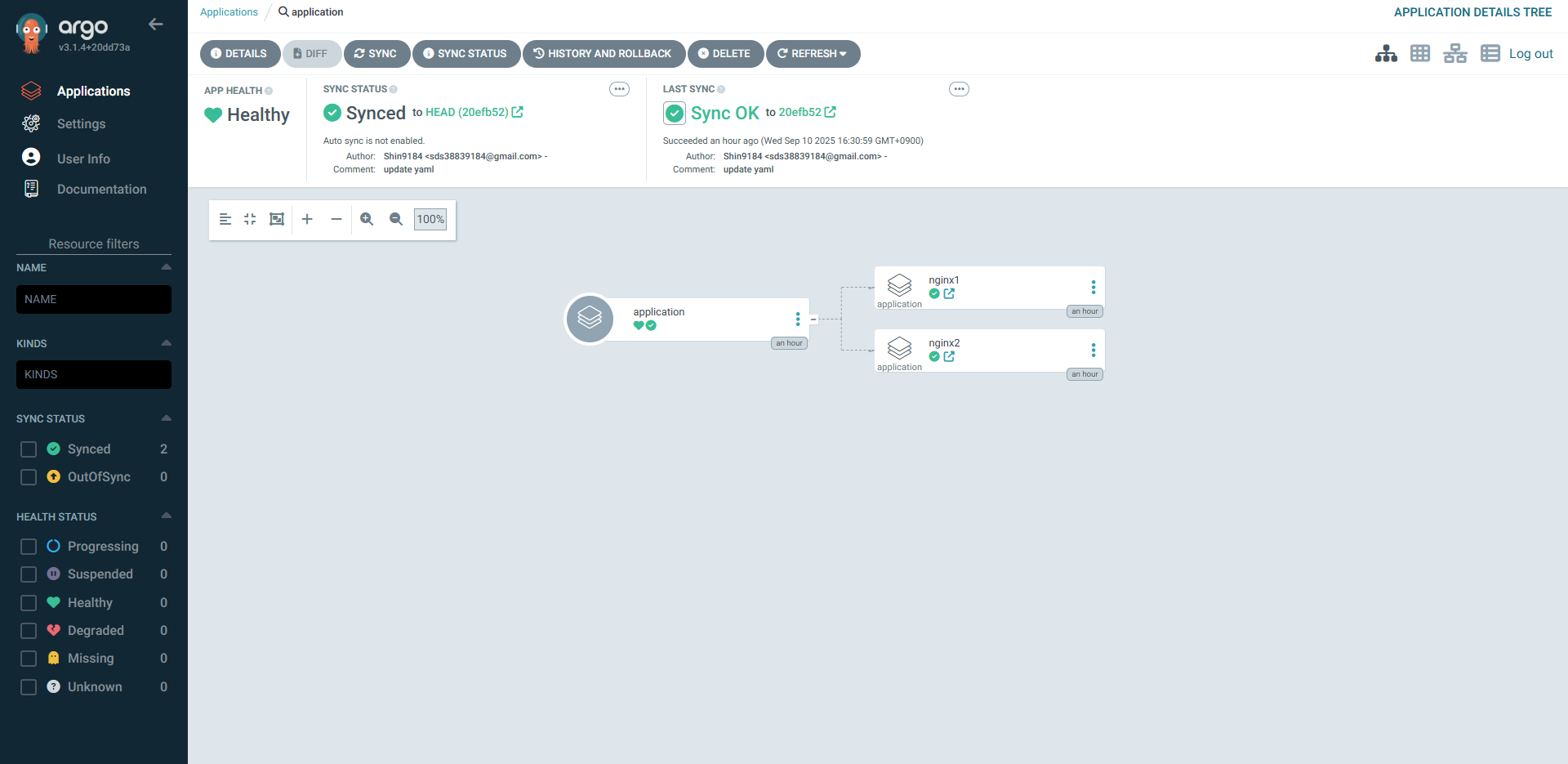 이것은 애플리케이션 변경 사항이 모두 Git에 남고, ArgoCD는 이를 읽어 클러스터 상태를 동기화하기 때문에 GitOps 답게 변경 이력 관리와 배포를 할 수 있게 된다.
