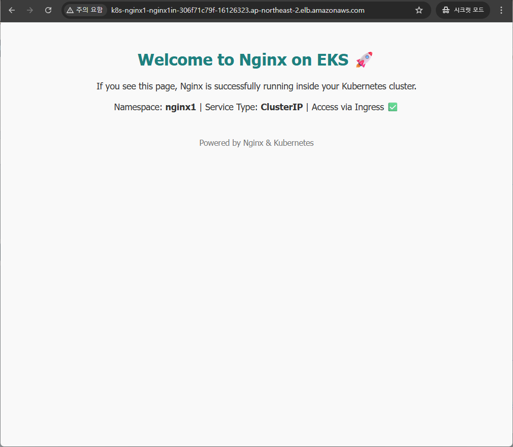 아래 화면에 보이는 접속 시 보이는 내용은 각 Pod Nginx에 html 파일을 수정하였다.