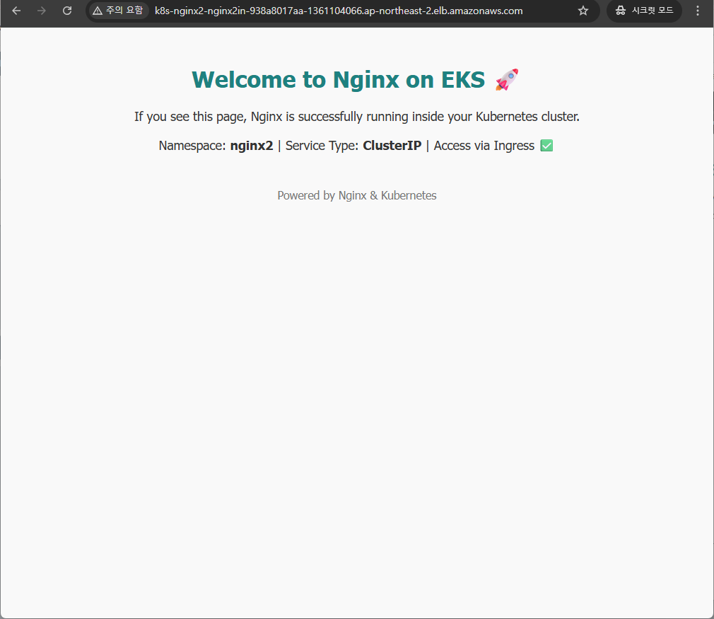 각 애플리케이션에서 Ingress를 따로 생성하여 접속 시 각 파드로 접속된 것을 확인할 수 있다.