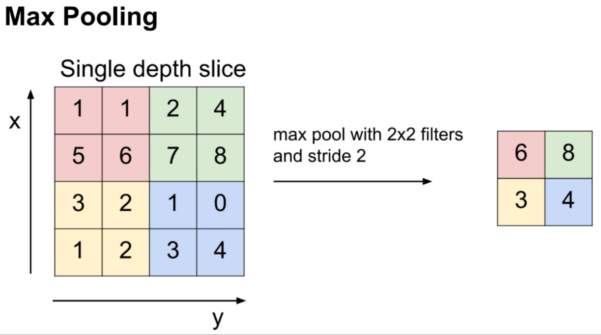 2x2 filter크기로 max pooling을 진행하면 위와 같이 된다. pooling kernel의 내부 픽셀들이 이동하거나 회전하더라도 같은 출력값을 가지게 된다.