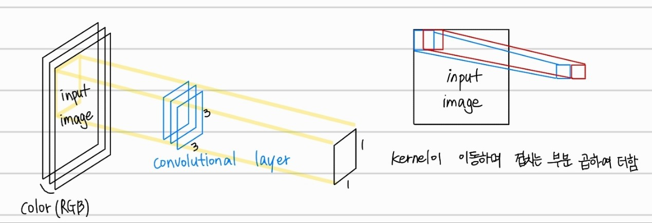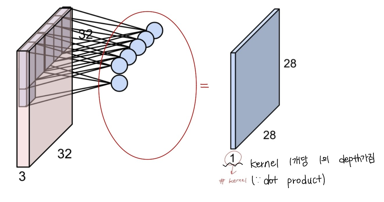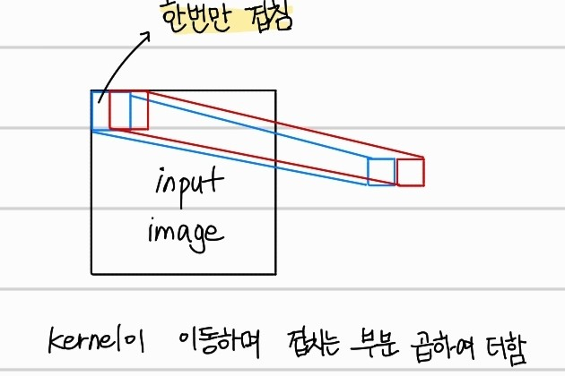 input image와 kernel이 겹친 부분을 stride만큼 이동하며 겹친 부분들의 내적을 output으로 가진다.출력된 한 channel당 width와 height는