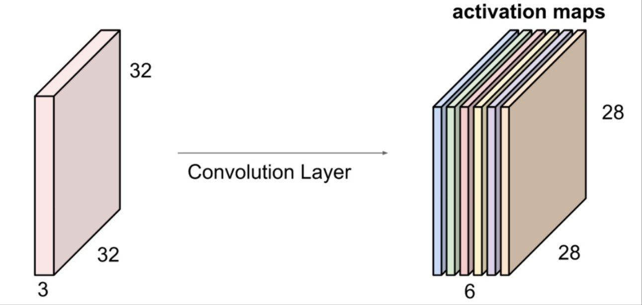 이미지의 특징을 추출하는 계층이다. 각 필터는 다양한 특징인 선,모서리,질감 등을 감지할 수 있게 학습된다. kernel의 갯수만큼의 convolutional layer의 출력값의 channel이 정해진다. 위의 사진은 5x5x3 의 kernel을 6개 사용한 결과이다.