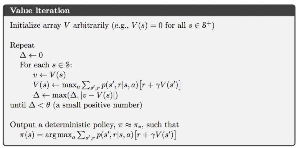 max인 값을 계속 받아오는 것이기 때문에, iteration마다 변하는 최댓값에 의해 policy improvement가 자연스럽게 된다. 한번, value function의 값이 optimal하면, policy에 의해 나오는 값 또한 무조건 optimal한 성질을 사용해서 policy iteration보다 빠르게 optimal bellman equation을 구하는 것이다.