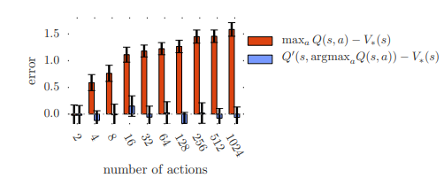 action의 수가 늘어날 수록, vanilla Q-learning은 error가 늘어나는 것을 확인 할 수 있다. Double Q-learning은 error가 action의 수에 비례하지않음을 확인할 수 있다.