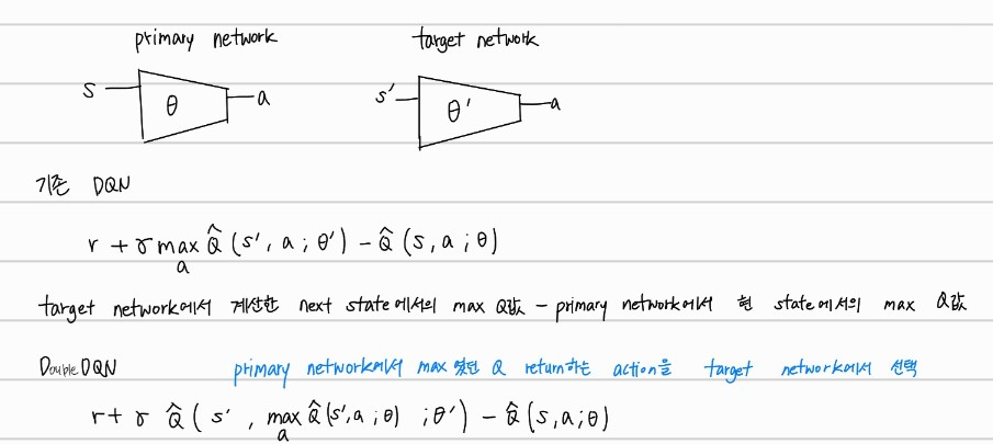 target network에서의 max Q값을 return하는 a를 선택하는 것이 아니라, main network에서 max Q값을 return하는 a를 target network에서 선택하는 것이다.