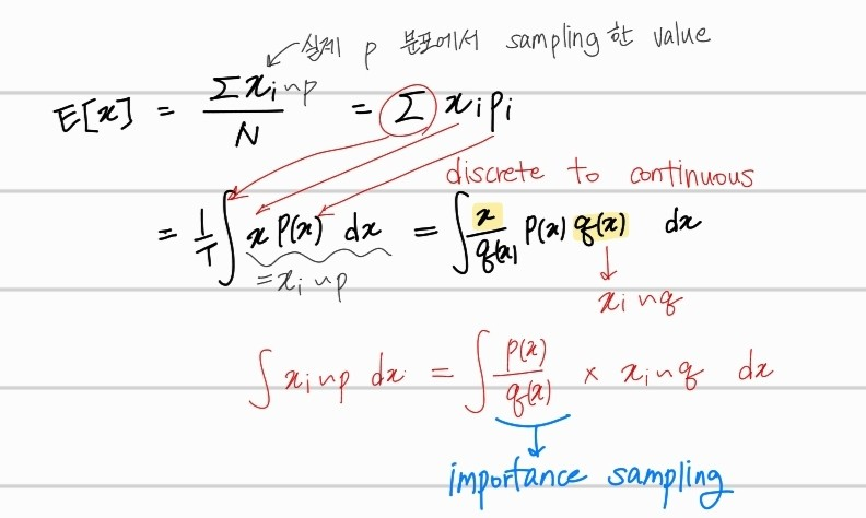 수식의 노란색으로 칠한 부분 xq(x)는 q분포에서의 sample값을 의미한다. 즉 importance sampling weight을 곱하면 q에 대한 sampling값만 존재한 상태에서 p 분포에 대한 sampling값을 얻을 수 있는 것이다.