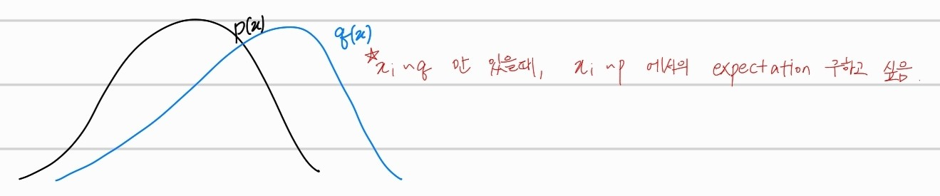 q(x)분포를 p(x)에 맞추어 보는 것이다. q(x)에 대한 sampling값만 존재할때, p(x) 분포에 대한 sampling을 하기 위해 importance sampling을 하는 것이다.