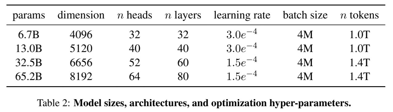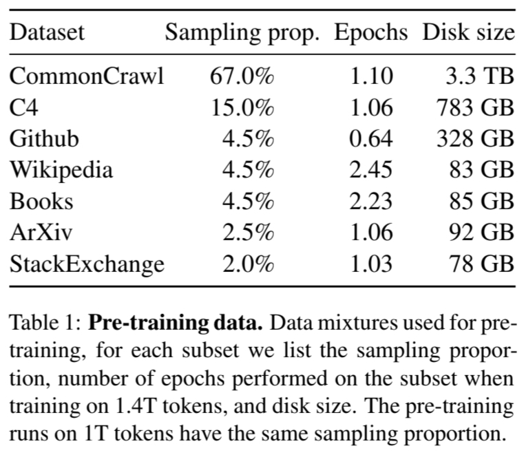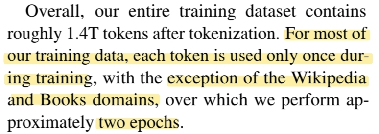 토큰화 이후 training 데이터셋은 전체적으로 1.4T token을 포함한다. 대부분은 훈련 중 한번 사용되었고, Wikipedia와 Books 도메인만 2 epoch에 걸쳐 사용되었다.
