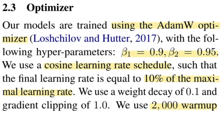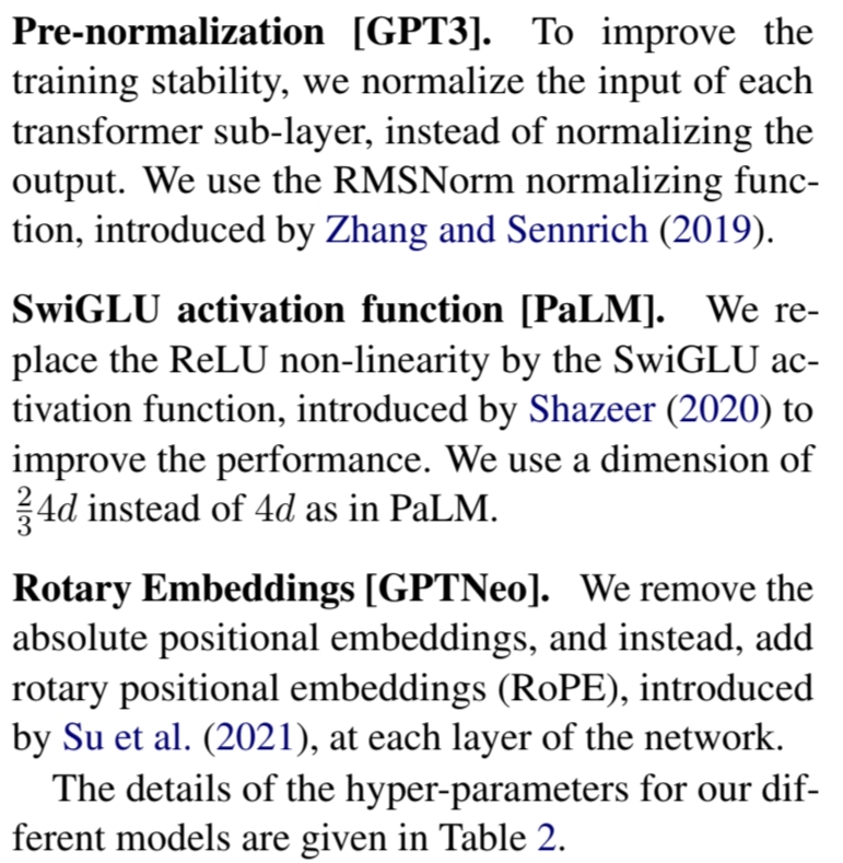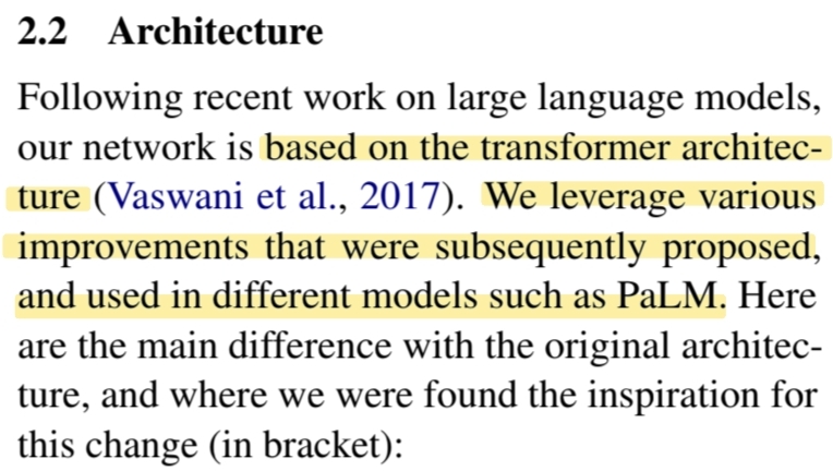 transformer 구조를 기반으로 하고, PaLM같은 모델에서 사용된 다양한 개선사항을 활용했다.