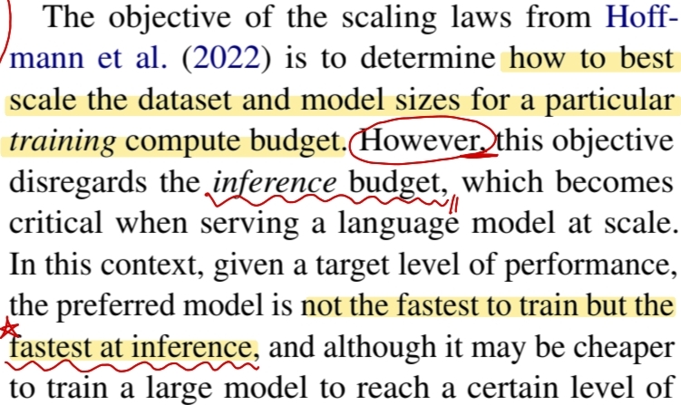 사실 추론 예산 관련된 부분이 언어 모델을 제공할때 더 중요한 부분이다. 따라서, 학습시가 아닌 추론시 가장 빠른 모델이 선호된다. 더 작은 model은 또한, 추론 과정에서 훨씬 값쌀 것이다.