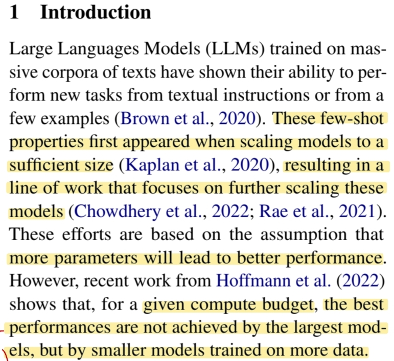 LLaMA는 7B에서 65B 사이즈의 언어모델이다. 공개적으로 사용 가능한 데이터셋으로 SOTA 모델들을 학습할 수 있다는 것을 보여준다. LLaMA-13B 모델은 GPT-3를 대부분의 기준에서 능가하고, LLaMA-65B는 Chinchilla-70B나 PaLM-540B와 같은 최고의 모델들과 경쟁이 가능하다.Introduction