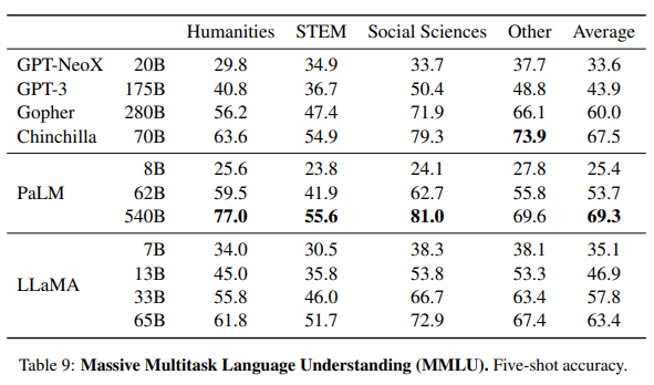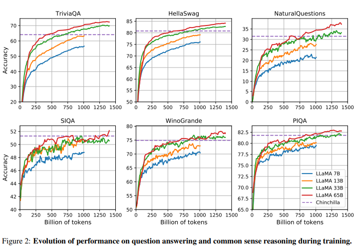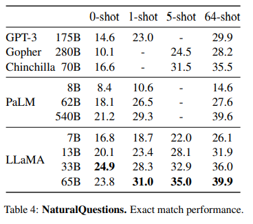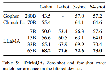 앞서 초록에서 언급한것과 같이 LLaMA-13B 는 GPT-3의 성능을 앞섰고, LLaMA-65B는 Chinchilla와 PaLM-540B와 경쟁력을 가졌다.