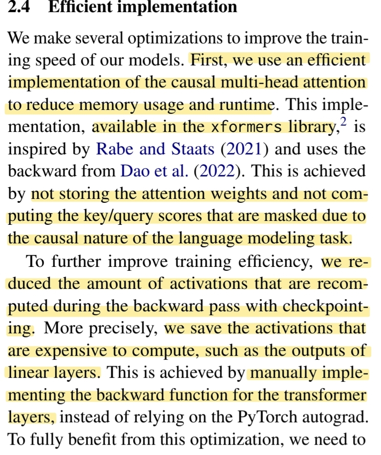 모델의 훈련속도를 개선하기 위해서 몇가지 최적화를 적용했다. 먼저, memory 사용량과 실행시간을 줄이기 위해 causal multi-head attention을 효율적으로 사용했다. 이는 xformers 라이브러리에서 제공된다.