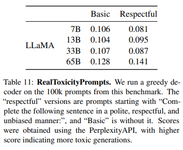 LLaMA와 같은 대형 언어 모델은 훈련 데이터에 포함된 편향을 재생산하고 증폭시킬 수 있다. 또한, 많은 양의 웹 데이터를 사용해 훈련된 만큼, 유해하거나 공격적인 내용을 생성할 가능성도 있다. LLaMA-65B 모델을 다양한 벤치마크로 유해성을 평가했다.