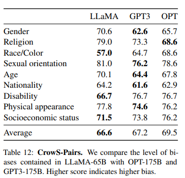 9가지 카테고리에 대한 고정관념을 평가한 결과다. LLaMA는 종교와 나이 관련 편향에서 특히 강한 편향을 나타냈다. 이러한 편향은 CommonCrawl 데이터셋에서 비롯된 것으로 보이며, 데이터 필터링에도 불구하고 나타났다.
