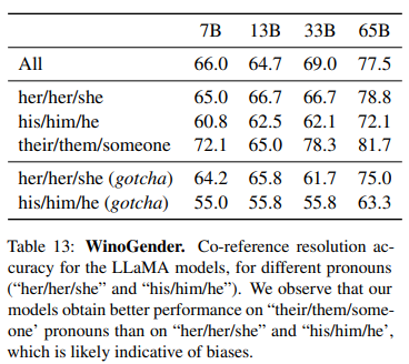 LLaMA의 성별 편향도 조사했다. 특히, 성별 대명사 관련 과제에서 성별 중립 대명사인 'their'에 대해선 잘 처리했지만, 'his', 'her' 같은 특정 성별 대명사에 대해선 편향된 결과를 보였다. 특히, 전형적인 성별 역할에 맞지 않는 직업과 연결될 때 더 많은 편향이 드러났다.