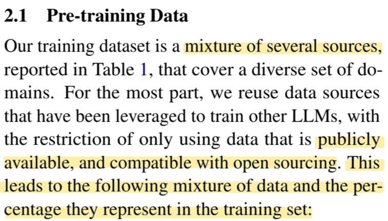 LLaMA 모델을 학습하는 데에는 공개적으로 접근 가능한 데이터만 사용하였기 때문에 어느정도 제한이 존재했다. 따라서, 다양한 domain의 data가 혼합되어 training set이 구성되었다.