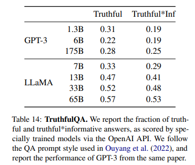 LLaMA-65B 모델은 GPT-3보다 높은 점수를 기록했지만, 여전히 정답을 생성하는 비율이 낮아, 모델이 허위 정보나 잘못된 답변을 생성할 가능성이 존재한다는 것을 보여준다.