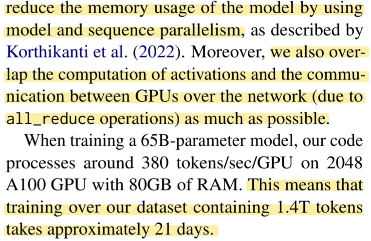 model과 sequence의 병렬화를 통해서 여러 GPU에서 처리해 memory 사용량을 감소시켰다. 또한, GPU 간 통신과 activation 계산을 최대한 overlap 시켰다고 한다. 650억개의 파라미터 모델을 훈련할 때, 2048개의 A100 GPU를 사용해서 대략 21일 동안 훈련할 수 있었다고 한다.