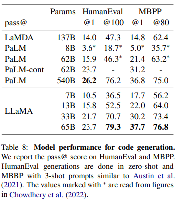 코드를 생성하는 task에도 LLaMA가 높은 성능을 보였다. 여기서 model은 설명과 주어진 test case에 대해 충족하는 코드를 작성해야 하는데, pass@k는 k개 prediction 중 k개 맞으면 pass임을 의미한다.