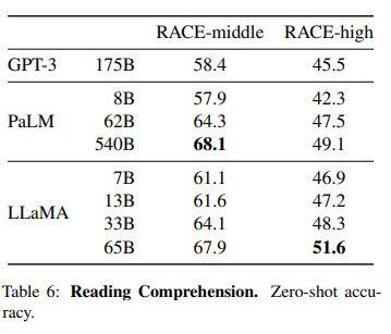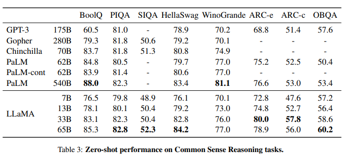 상식추론 과정에 대해서, LLaMA 13B 정도 모델이면 GPT-3보다 거의 대부분 앞서는 것을 확인할 수 있다. 65B 크기의 모델은 PaLM 보다도 뛰어나 거의 모든 벤치마크에서 가장 뛰어난 성능을 보이는 것을 확인할 수 있다.