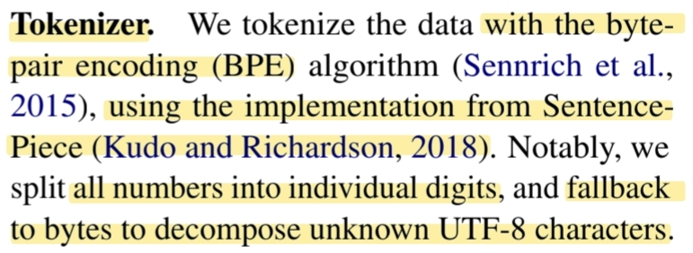 BPE 알고리즘을 사용해 tokenizing하였고, 정확히는 SentencePiece tokenizer를 사용하였다. 모든 숫자는 개별로 찢은 후, 알 수 없는 UTF-8 문자는 모두 byte로 분해했다고 한다.