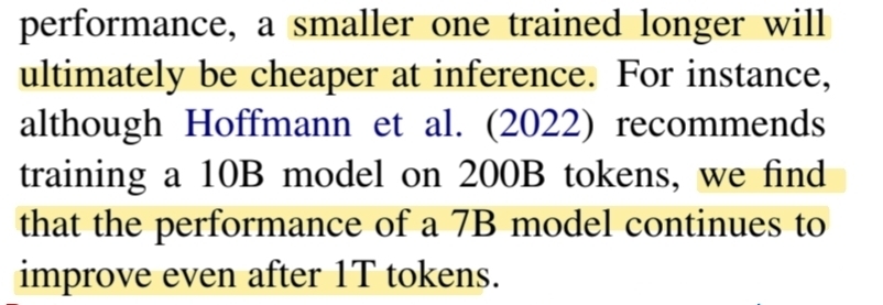Hoffman은 10B 크기의 model과 200B token을 제안했지만, 7B 크기의 model과 1T token을 사용해 더 높은 성능을 보였다.